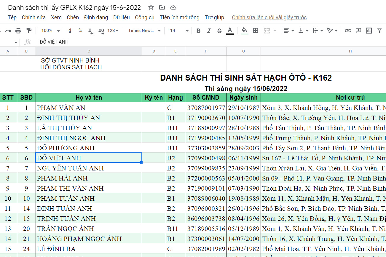 Danh sách K162 sát hạch lấy GPLX ngày 15/6/2022