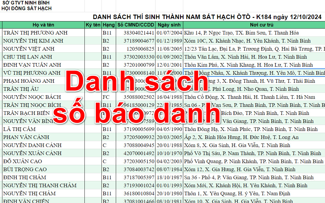 Danh sách Khóa 184 thi lấy GPLX ngày 12 và 13/10/2024