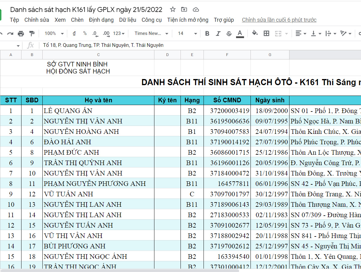 Danh sách sát hạch K161 lấy GPLX ngày 21/5/2022